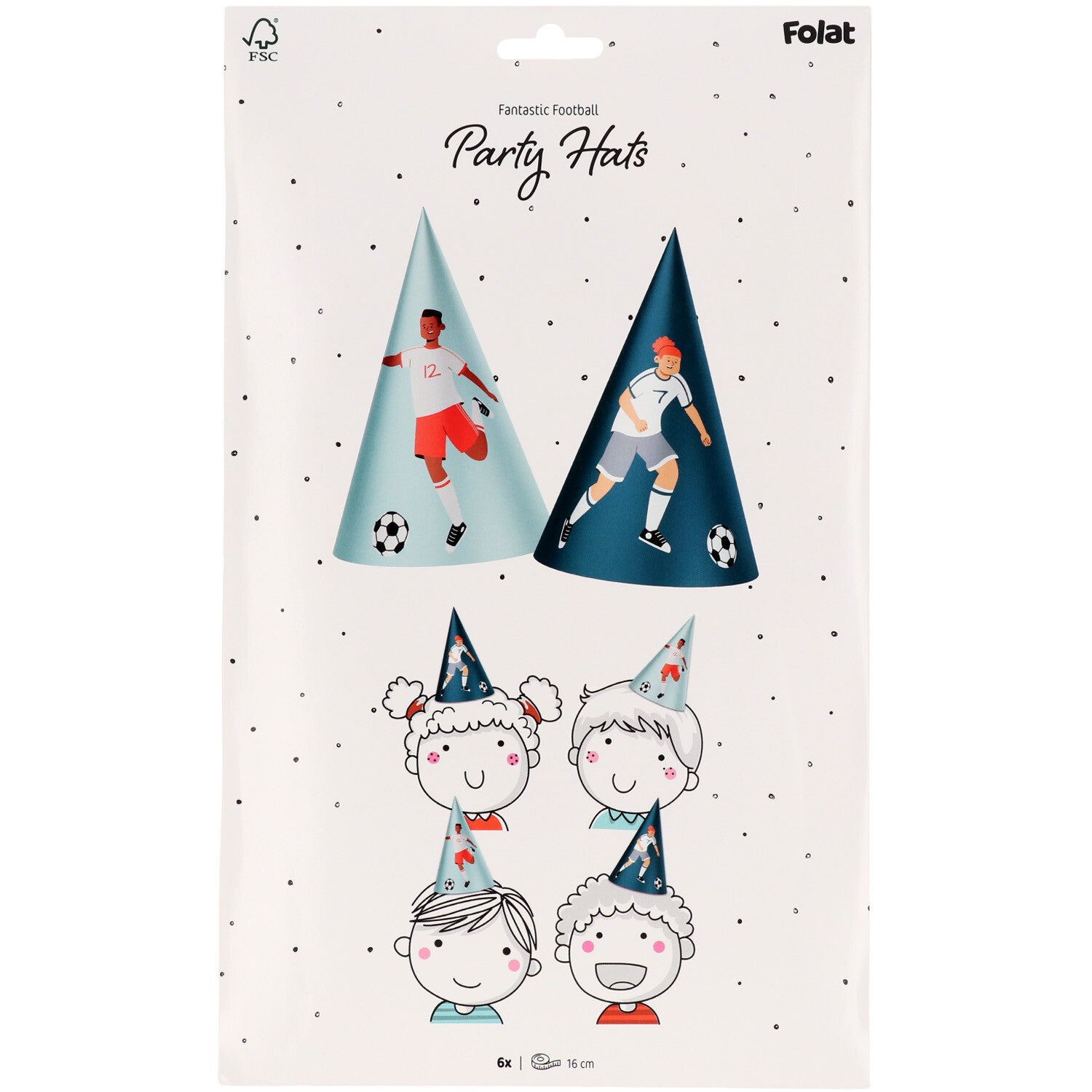 Set van 6 feesthoedjes bedrukt met voetballers. Voor een sportief tintje op elk feestje!
